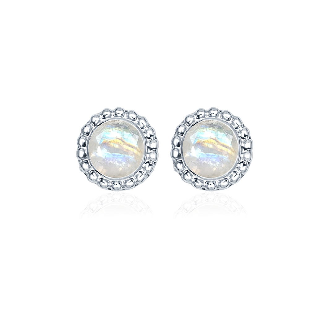 Silver Studs(design) with 5mm Round Rainbow Moonstone Gemstone in Band Setting