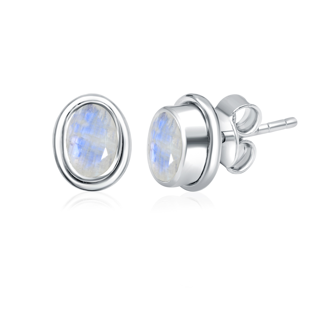 Silver Studs(plain) with 5x7mm Oval Rainbow Moonstone Gemstone in Band Setting
