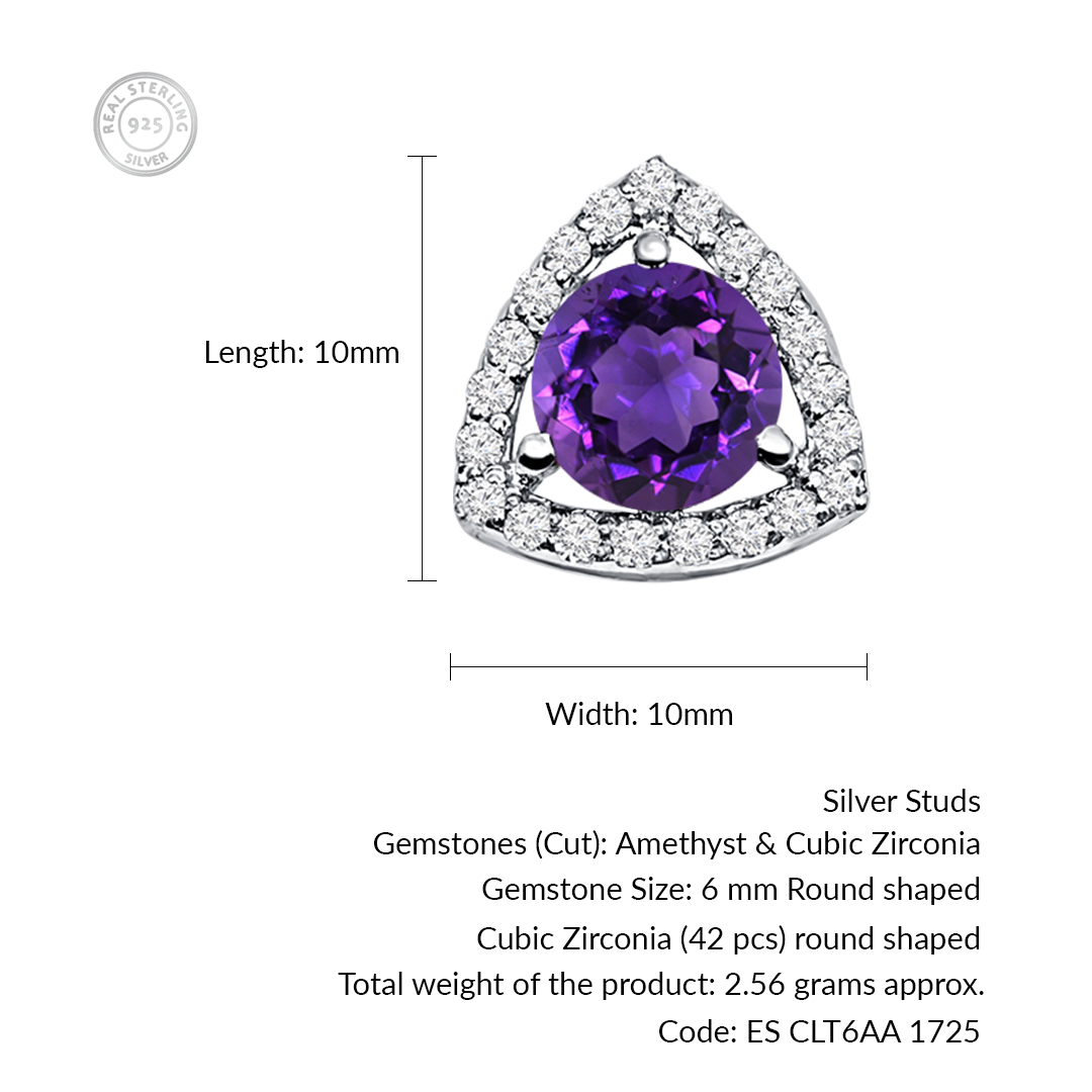 These triangular-shaped cluster silver studs showcase a captivating 6mm round amethyst gemstone at their center, surrounded by a sparkling array of cubic zirconia stones. The cluster design creates a bold yet elegant look, adding a touch of sophistication to any ensemble. Amethyst, known for its deep purple hue, is revered for its calming properties and is often associated with clarity and emotional balance. This versatile gemstone is said to promote serenity, making these earrings not only a beautiful fashion accessory but also a meaningful piece for daily wear or special occasions. Perfect for adding elegance and positivity to any look.