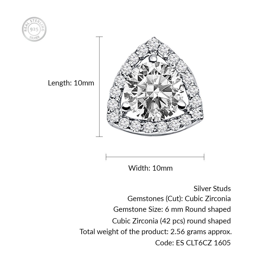 These Triangular Shaped Cluster Silver Studs feature a dazzling 6mm round cubic zirconia gemstone at the center, surrounded by smaller cubic zirconia accents. The triangular design enhances the brilliance of the stones, creating a modern yet timeless look. Cubic zirconia is known for its stunning clarity and sparkle, often used as a high-quality, affordable alternative to diamonds. It symbolizes beauty and elegance, making it a popular choice in fine jewelry. Set in sterling silver, these earrings offer a sophisticated shine, perfect for both everyday wear and special occasions, adding a touch of luxury and radiance to any outfit.