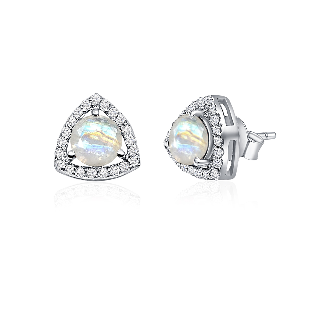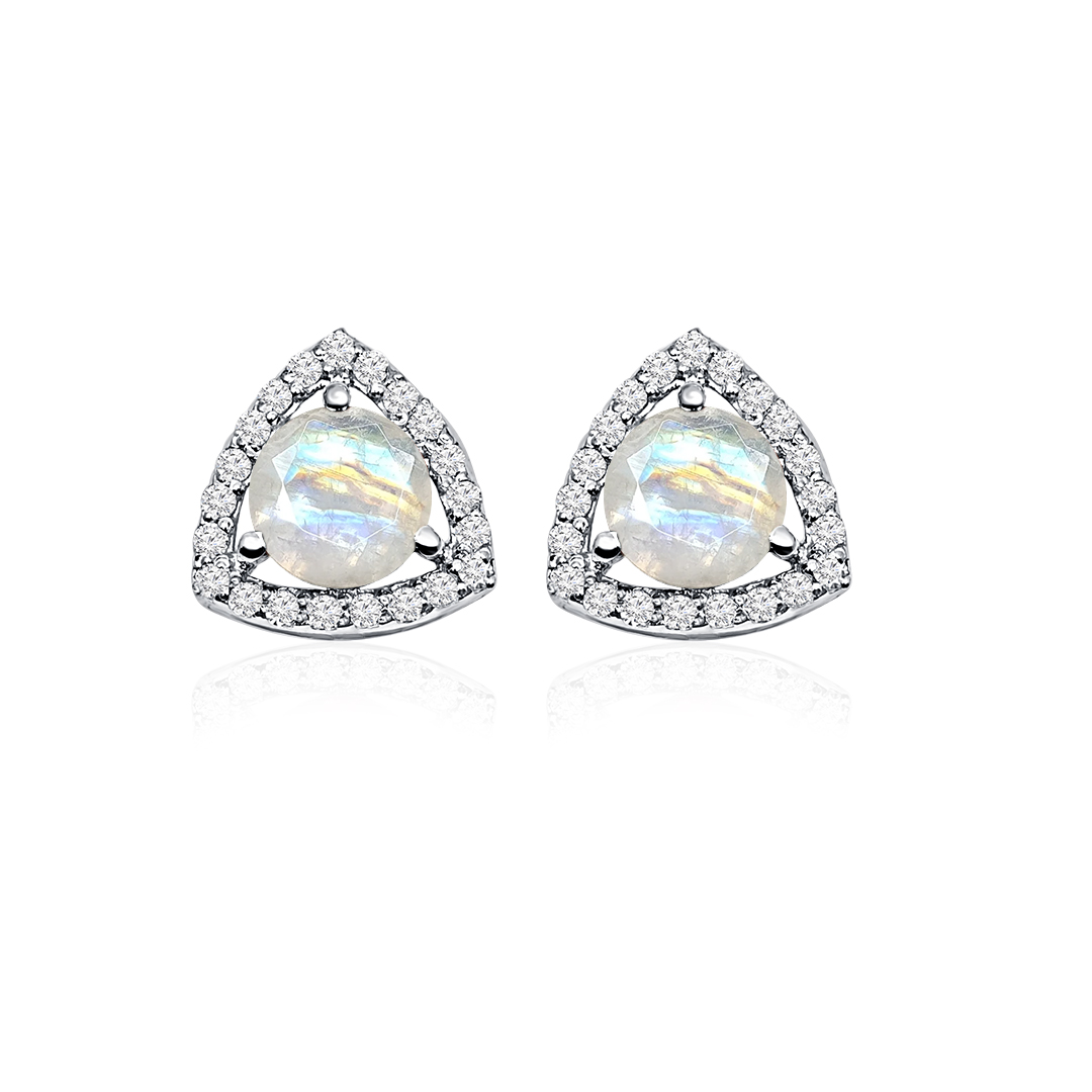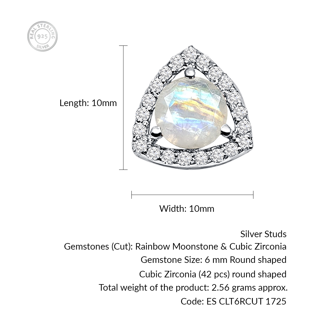 Triangular Shaped Cluster Silver Studs with 6mm Round Rainbow Moonstone Gemstone & small round Cubic Zirconia