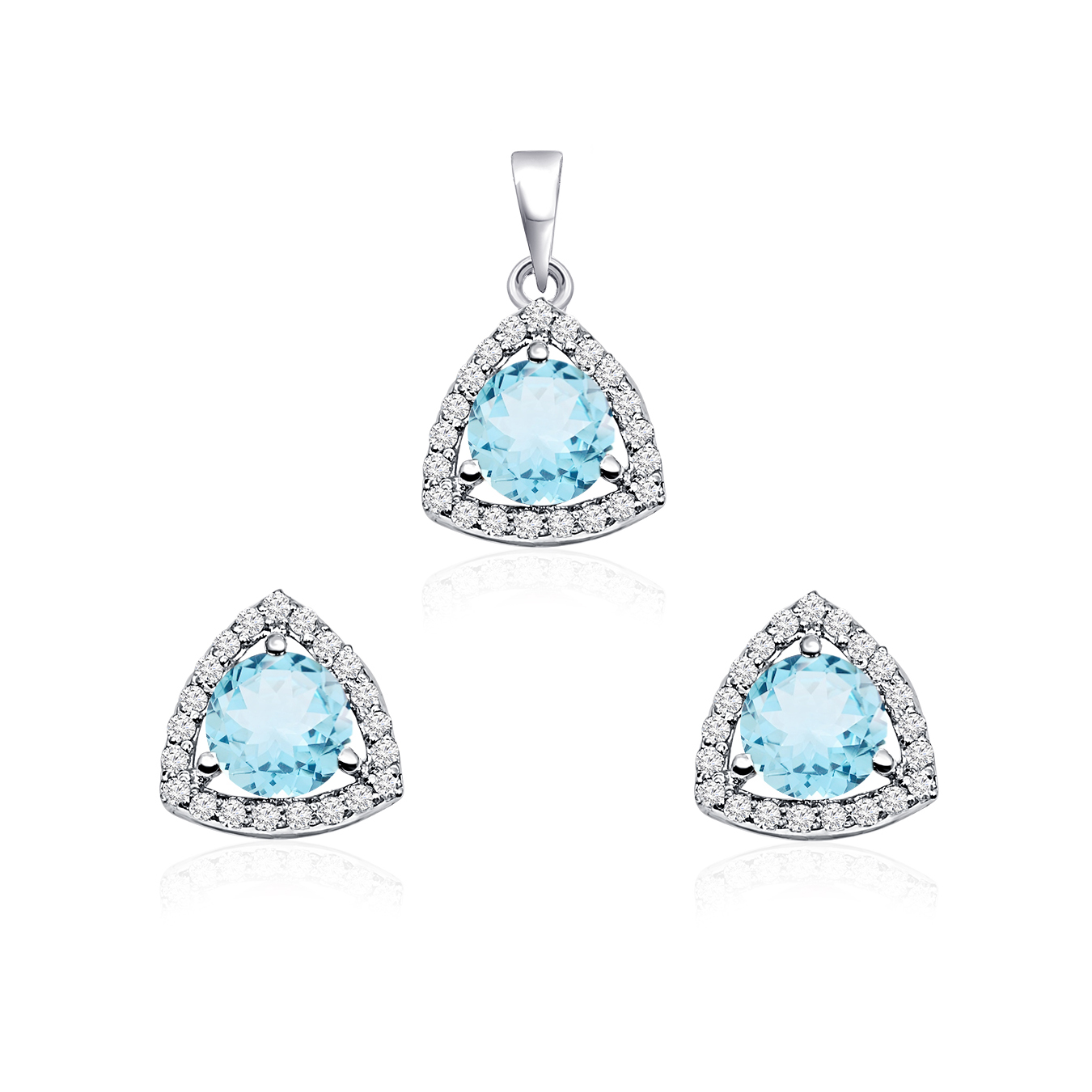 This exquisite triangular-shaped cluster silver pendant set features a central 6mm round blue topaz gemstone, complemented by shimmering cubic zirconia stones that radiate elegance. The pendant, accompanied by matching stud earrings, has been crafted to enhance the natural brilliance of blue topaz. Known for its clarity and calming hues, blue topaz is believed to inspire creativity and clear communication, making it a popular choice for meaningful gifts. Set in high-quality silver, this pendant set is versatile for both daily wear and special occasions, adding a touch of sophistication and a splash of color to any ensemble.