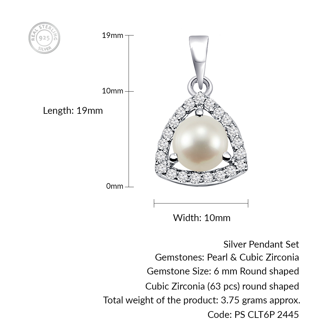 Triangular Shaped Cluster Silver Pendant Set with 6mm Round Pearl Gemstone & small round Cubic Zirconia