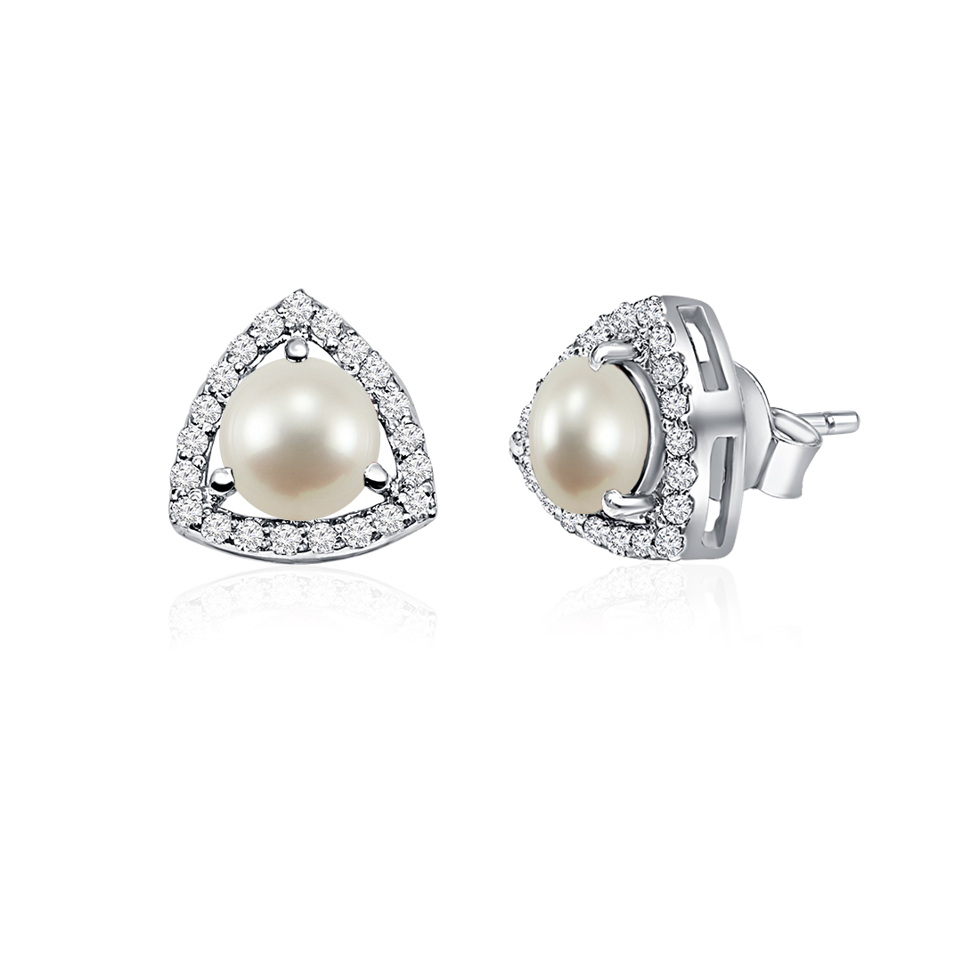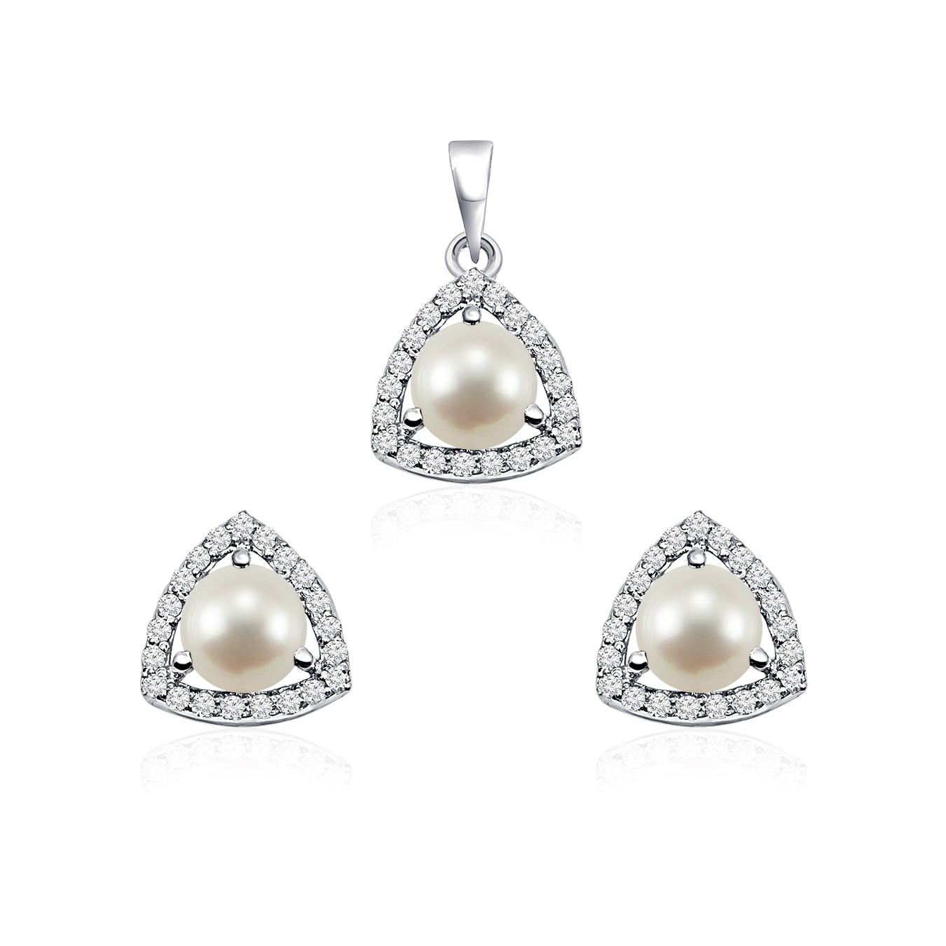 This exquisite Triangular Shaped Cluster Silver Pendant and Stud Set features a beautiful 6mm round pearl gemstone at the center, surrounded by a cluster of sparkling cubic zirconia. The modern triangular design adds a contemporary edge to the timeless elegance of pearls. Pearls symbolize purity, wisdom, and emotional balance, often associated with enhancing inner peace and promoting personal growth. The soft, iridescent glow of the pearl, combined with the brilliance of cubic zirconia, creates a perfect harmony of sophistication and grace. Set in sterling silver, this set is ideal for elevating any outfit with a touch of refined luxury.
