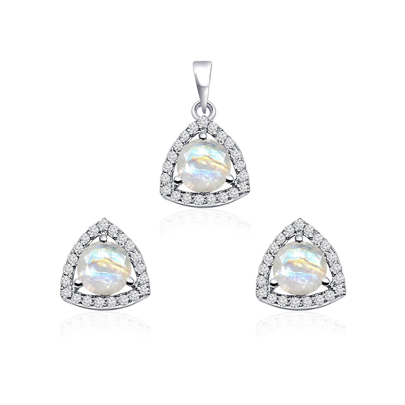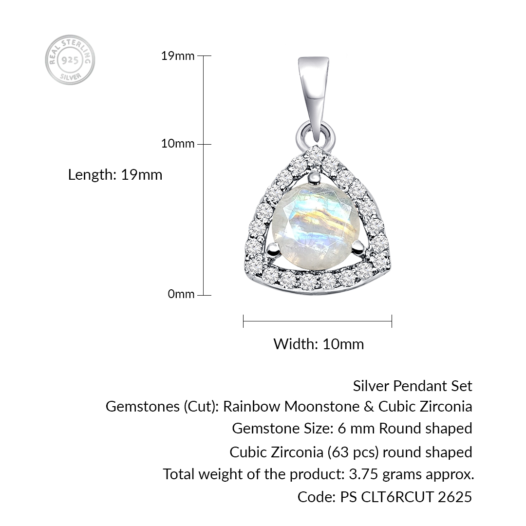 Be the first to review “Triangular Shaped Cluster Silver Pendant Set with 6mm Round Rainbow Moonstone Gemstone & small round Cubic Zirconia” Cancel reply