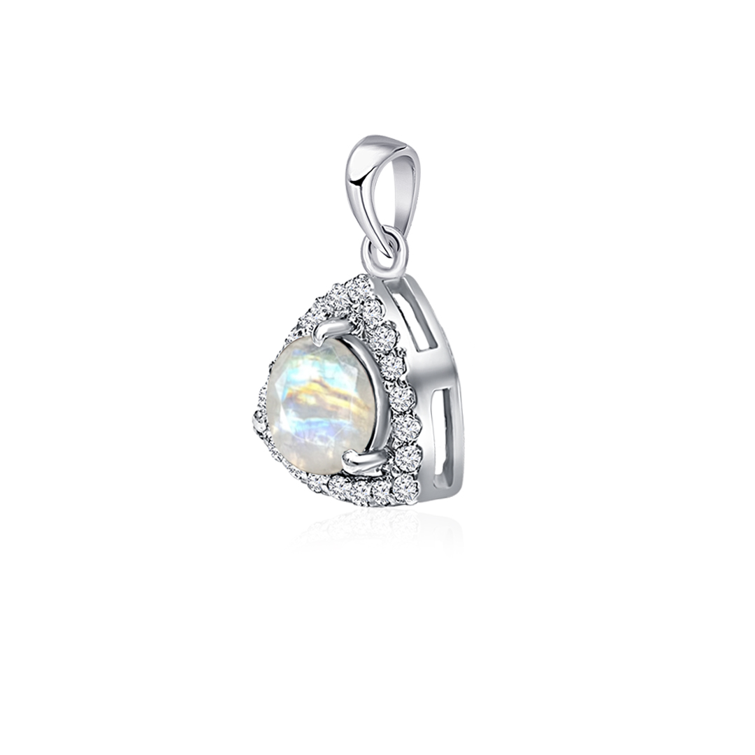 Triangular Shaped Cluster Silver Pendant Set with 6mm Round Rainbow Moonstone Gemstone & small round Cubic Zirconia