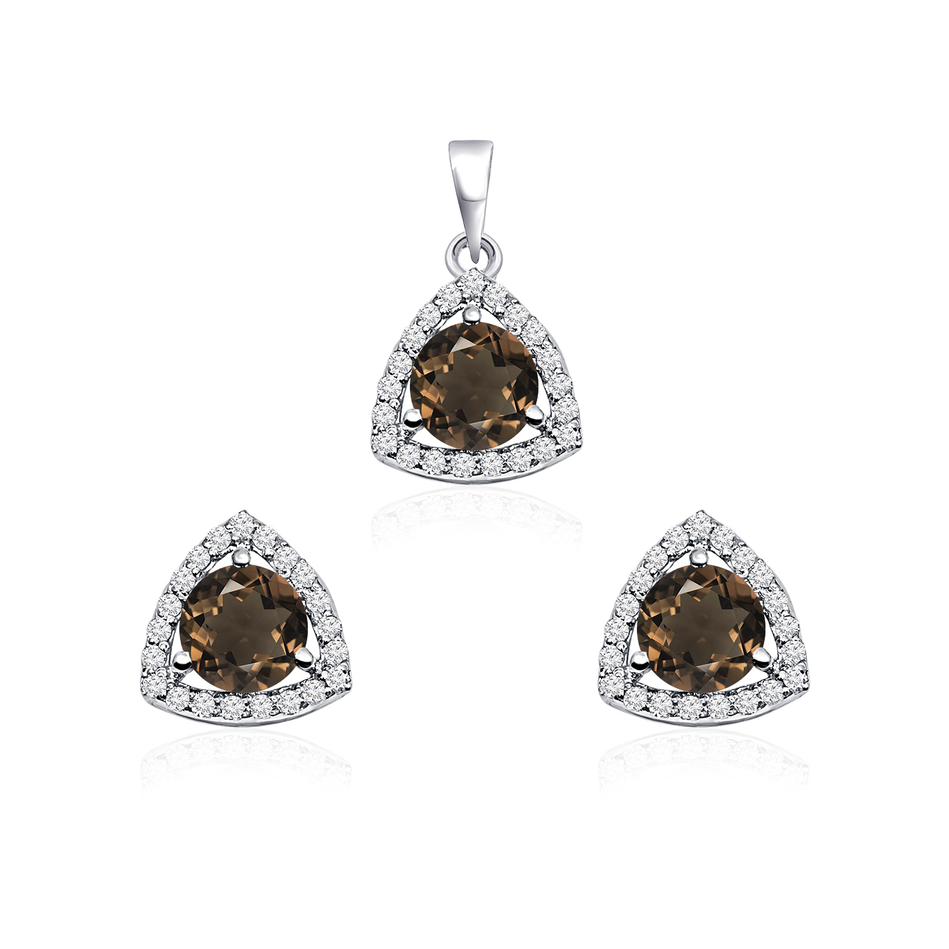 This elegant Triangular Shaped Cluster Silver Pendant and Stud Set features a stunning 6mm round smoky topaz gemstone, surrounded by a cluster of radiant cubic zirconia. The modern triangular design adds a unique flair, making this set perfect for both everyday wear and special occasions. Smoky topaz, with its rich brown hue, is known for its grounding and calming properties, often used to relieve stress and promote emotional healing. The warm tones of the smoky topaz complement the brilliance of the cubic zirconia, creating a harmonious and sophisticated look in sterling silver that enhances any outfit with timeless elegance.