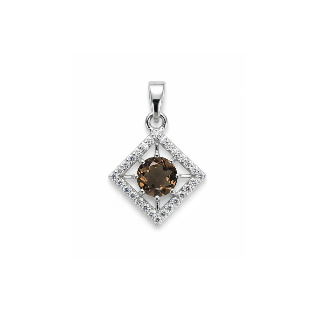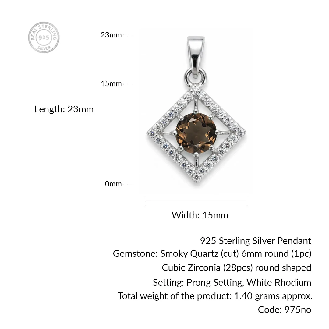 Silver Pendant (square shaped) with 6mm round shaped Smoky Quartz Gemstone and small round Cubic Zirconia