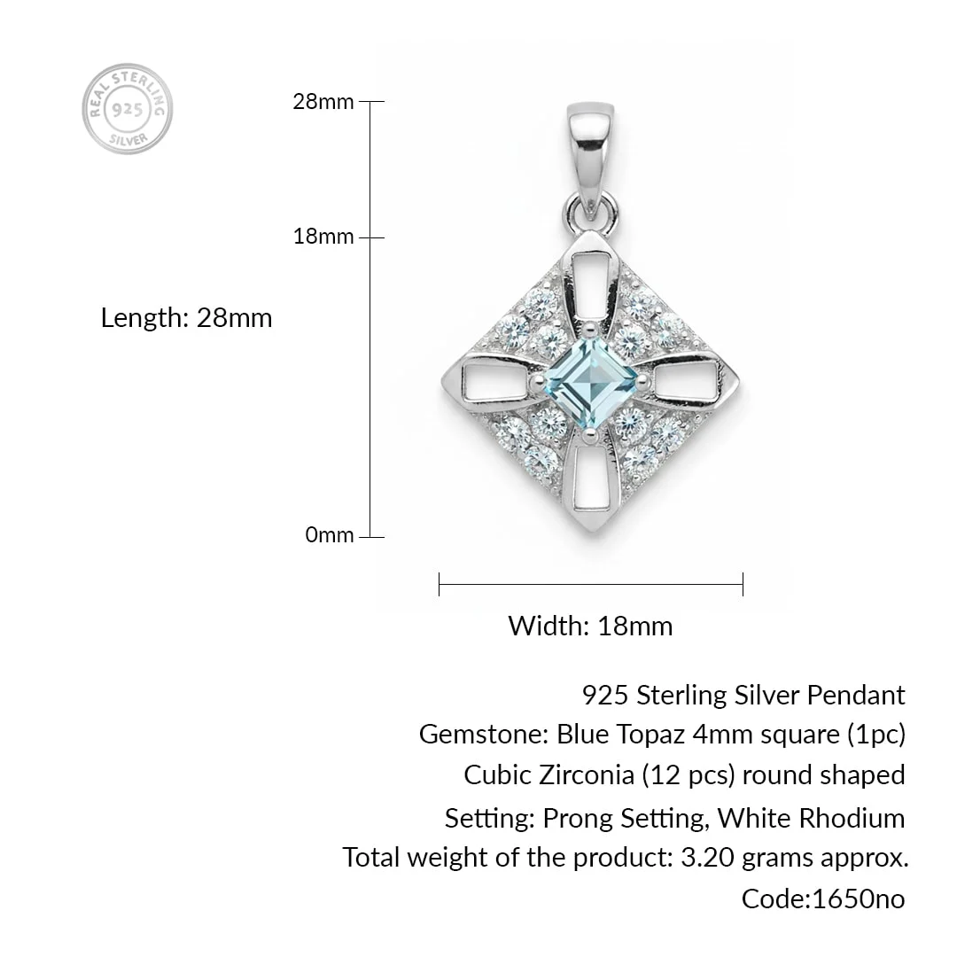 Silver Pendant with 4mm Square shaped Blue Topaz Gemstone and small round Cubic Zirconia