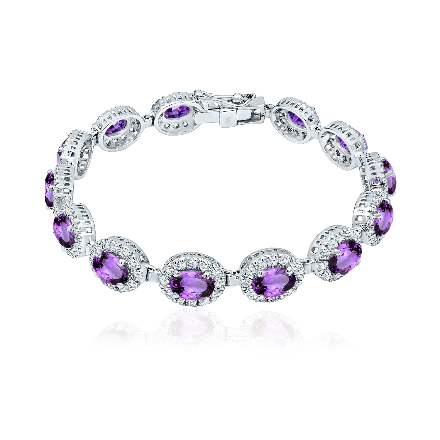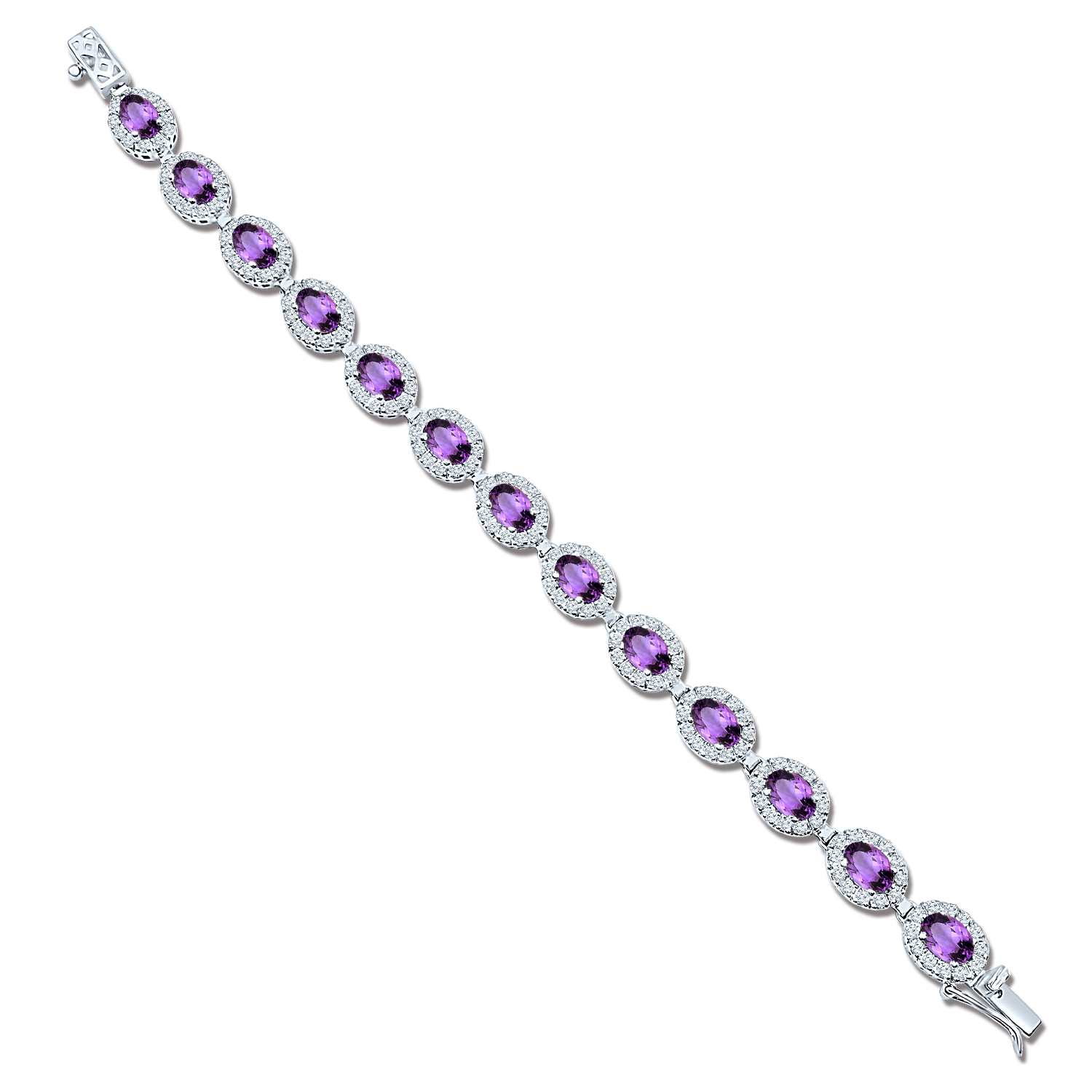 Cluster Silver Bracelet with 5x7mm Oval Amethyst Gemstone and small round Cubic Zirconia