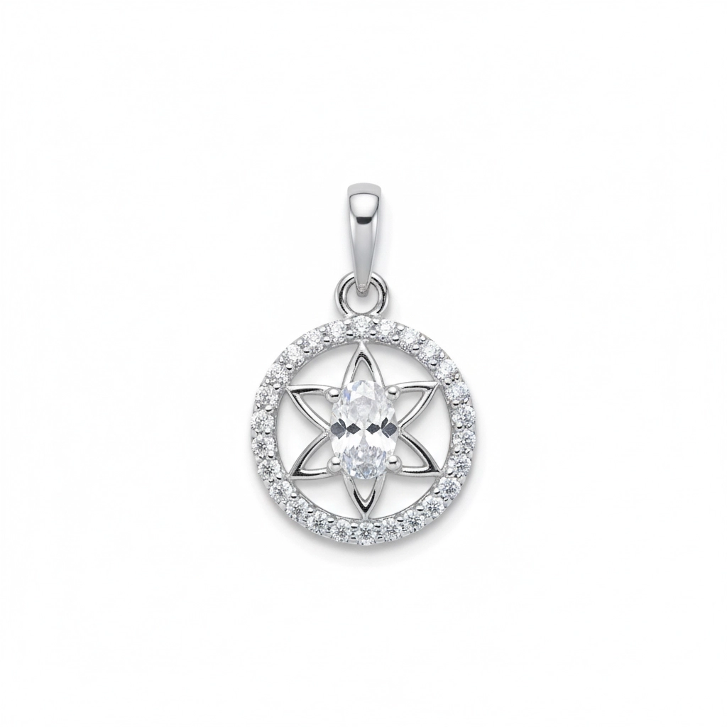 Silver Pendant (Flower shaped) with 6X4mm Oval Cubic Zirconia Gemstone and small round Cubic Zirconia