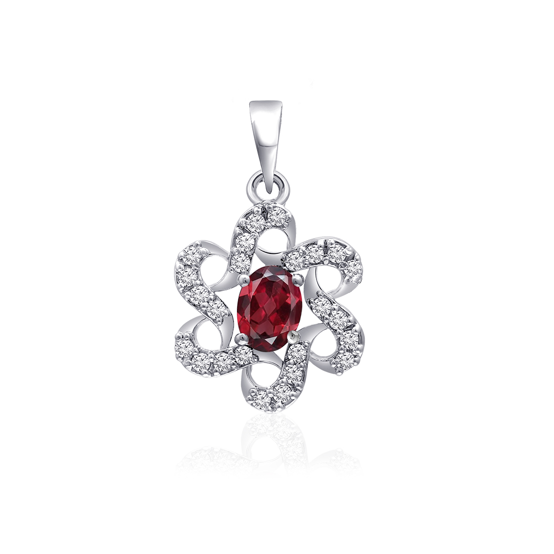 Silver Pendant (Flower shaped) with 6x8mm Oval Garnet Gemstone and small round Cubic Zirconia